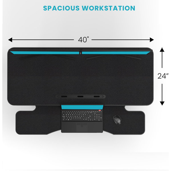Transform your workspace into an oasis of productivity and well-being with the power riser desk converter. This revolutionary desk riser, equipped with electric height adjustment, effortlessly converts your standard desk into an ergonomic stand-up desk, ushering in an era of enhanced focus, fitness, and a healthier lifestyle. The 40" wide spacious two-tier design boasts a large work surface and keyboard tray, providing ample room for dual monitors or a monitor and laptop setup. With its innovative design, you can easily find your ideal height with the simple push of a button, offering unlimited stopping points without any effort or strain.