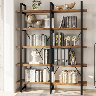Balancing classic character with understated industrial style, this clean-lined étagère bookcase brings a taste of what’s trending to any layout in your home. This tall and narrow design features five tiers made from wood in a neutral stain to offer plenty of display space without wasting too much square footage. Its crossed-back support and the tubular metal frame are finished in black for eye-catching contrast.