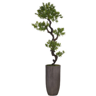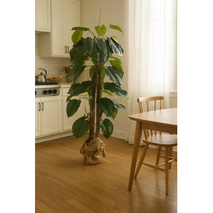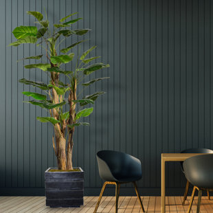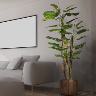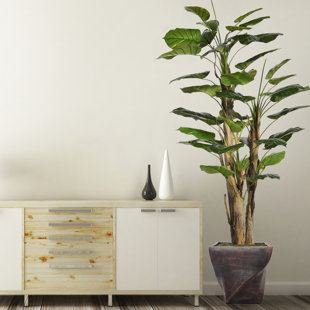 This Panama aureus tree brings a touch of green to your living room, bedroom, or home office. It's made of plastic, with lush, variegated green leaves and brown stalks. Plus, it comes in a pot wrapped in burlap and twine, so you can display it right away. It's made for indoor use only. This plant is a generous 66" high and 25" wide, making a distinctive statement in any modern, bohemian, or tropical setting.