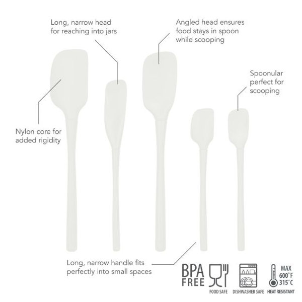The Flex-Core all-silicone spatula set features five unique spatulas for all your cooking and baking adventures! Each spatula features a nylon core that adds rigidity and strength, allowing you to tackle mixing, folding, spreading, and scraping with ease. The ergonomic handles make for comfortable grips, and the silicone material will protect your non-stick cookware. Flexible edges give you the right amount of give so that nothing is left in the bowl. Included in this set are a spatula, spoonula, jar scraper, mini spatula, as well as a mini spoonula. Elevate your cooking experience with Flex-Core, the spatulas that handle the heaviest mixing while providing the flexibility to easily scrape.