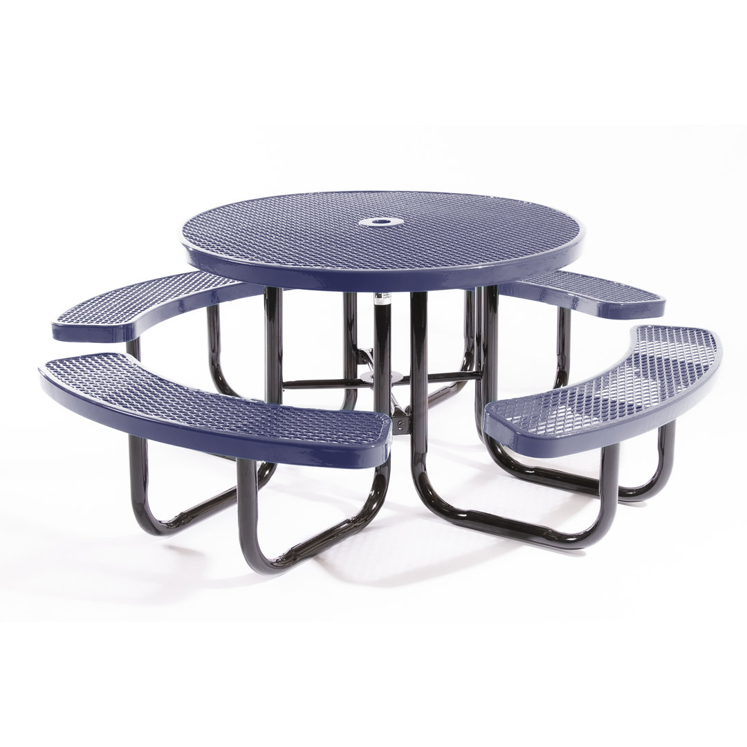 A charcoal metal picnic table with an umbrella hole, perfect for outdoor dining and easy clean-up.